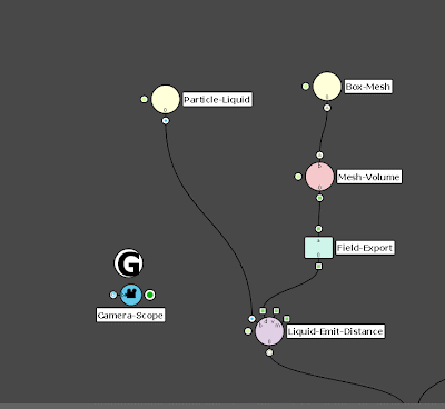 The branch on the right think of it as your emitter shape.  Here I’ve set up a simple box shape.  In order for the emitter to read that in it needs to go through a couple of extra nodes, first a MeshVolume which turns the Box_Mesh into a volume which is how Naiad interacts with particles.  Next that volume is is exported through a Field-Export.  Notice the circle and square shapes here.  The emitter node has a number of input plugs which are also circular and square.