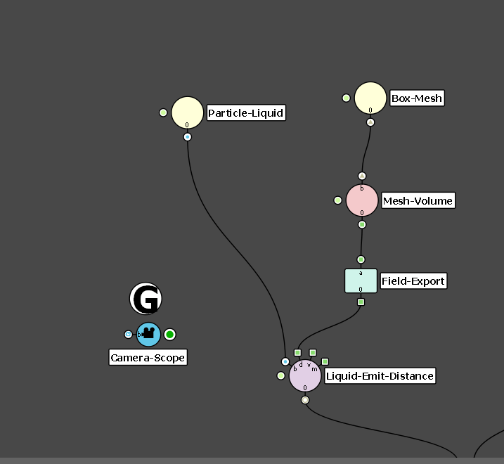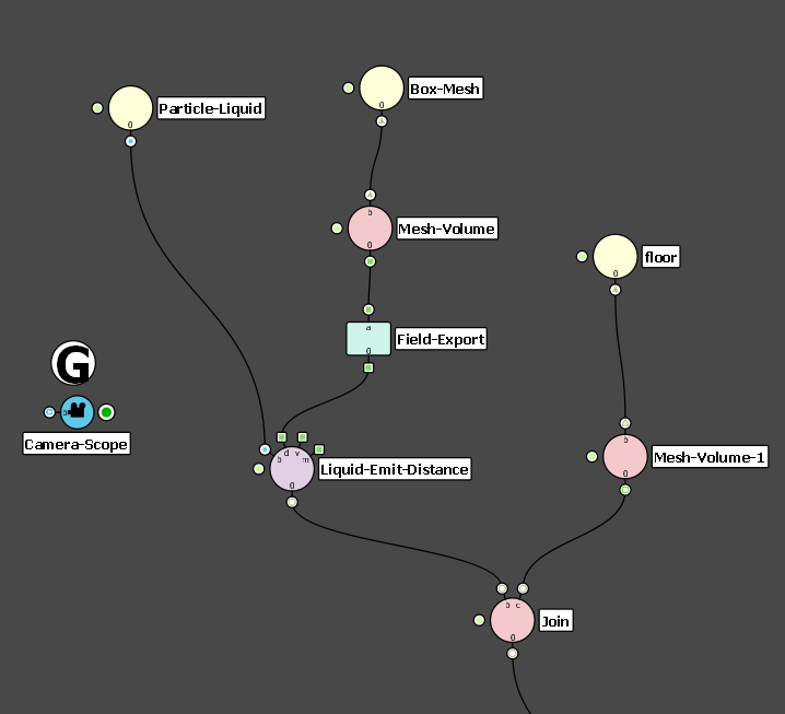 You’ll notice also a lage ‘G’ node and a camera scope – The ‘G’ node is the globals, it’s where you set  your project preferences and the like, the camera scope allows you to visualise the 3d scene – more about scopes later.