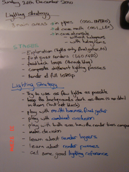 Before even starting the lighting in Maya I devised a strategy for completing all the shots on time to a high enough standard that would require as little rework as possible.  The date for finishing the lighting was Sunday 16th Jan 11 (yes that’s the Sunday before writing this post) and there is a fair amount of rework to be done…  But without a strategy I’d be even further adrift.