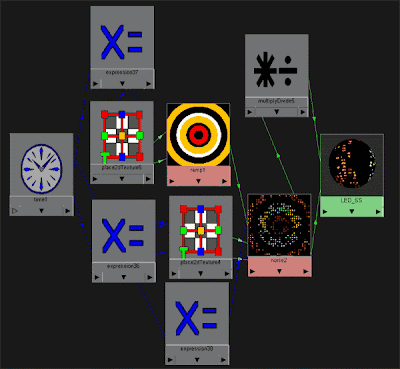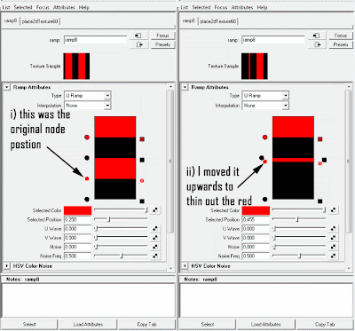 This was a lot better than the first pass, but both the speed of the ramp and the frequency was too much. In the final pass I slowed down the translate speed in the ramps move2d node and took out the speed from the frequency altogether.I did actually want to change the size of the red parts on the side. For some odd reason each time I changed the positions of the red colours in the ramp settings the other glow elements would be blown out completely.