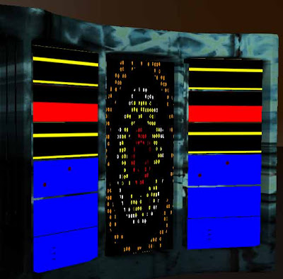 I decided to keep the left and right parts the same and focus on adding more advanced animation on the centre module. To achieve this I knew it would take more than just scrolling some textures across the length of the plane. I wanted the dots move in a more interesting fashion for the server to feel as if it was alive and running calculations to keep the arcade machine and holograms going.