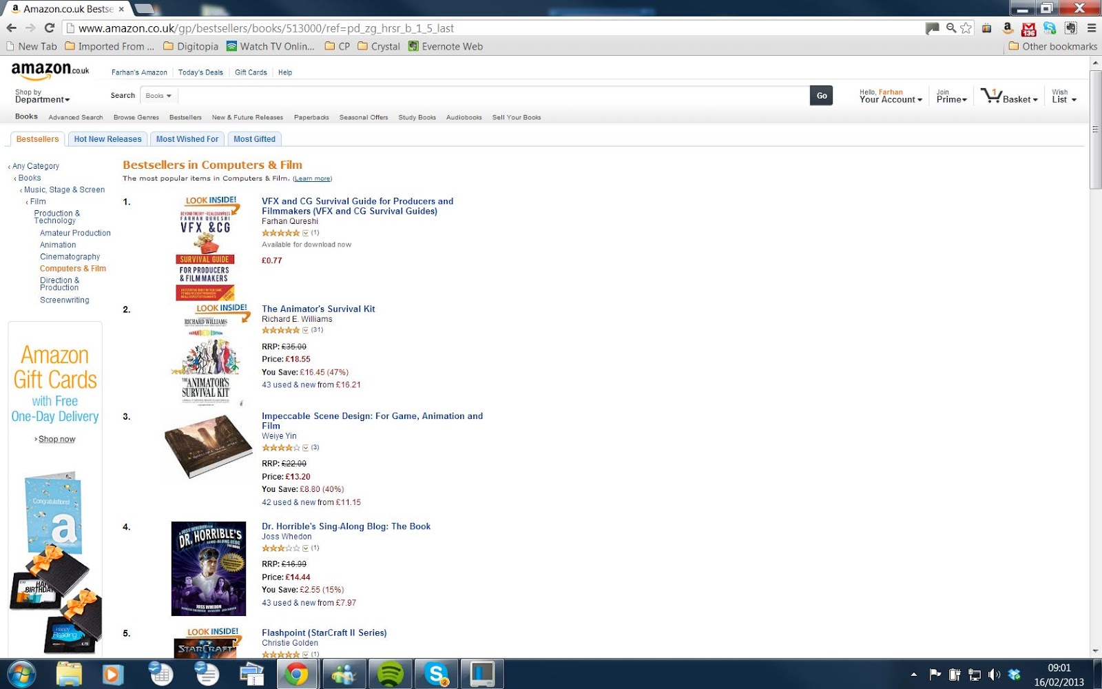 | Fig 2. VFX and CG for Producers and Filmmakers number 1 bestseller in ‘Computers and Film’ category on Amazon, 16th Feb 2013 |