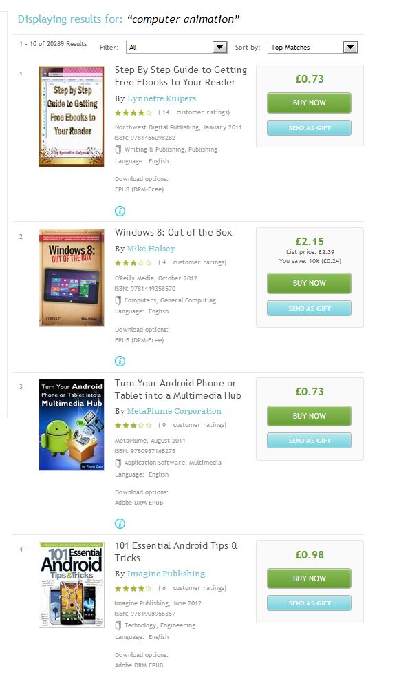 Fig 8. This is what the search results for ‘computer animation’ returned from the Kobo book store |