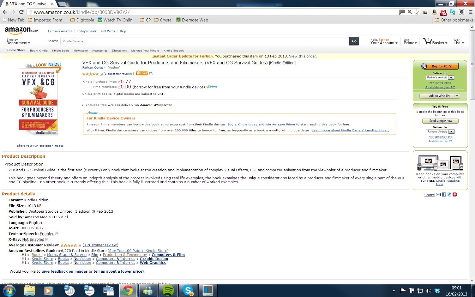 Fig 2. VFX and CG for Producers and Filmmakers number 1 bestseller in ‘Computers and Film’ category on Amazon, 16th Feb 2013 |